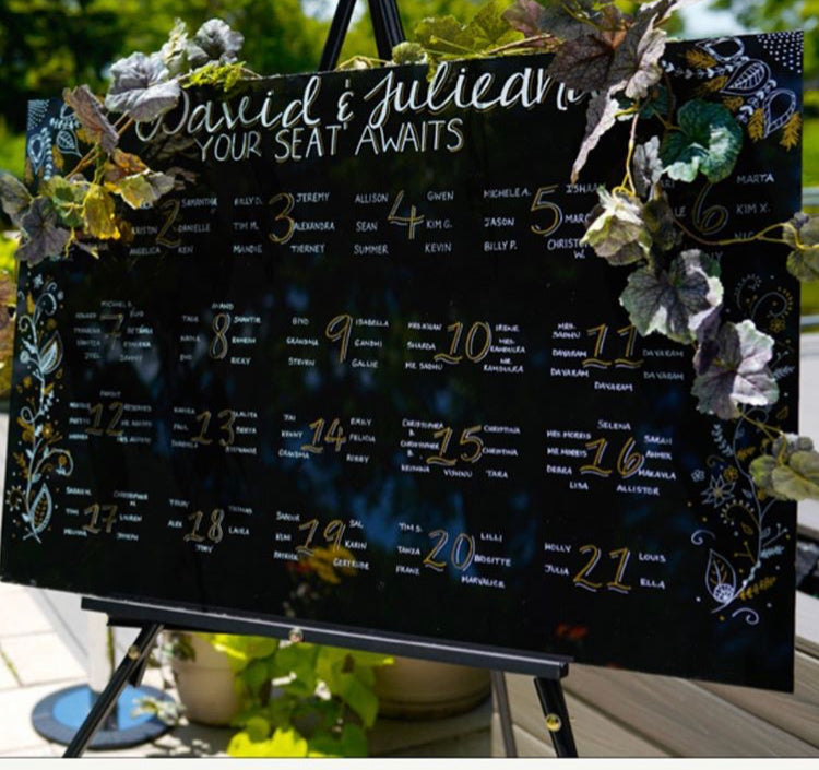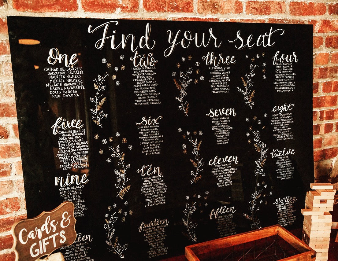 Please email guest list to alexgrecolettering@gmail.com after your purchase. Be sure to include your order number in the subject. Include wording for your chart header, lettering color, and whether you’d like other design elements like florals, gold foil etc.